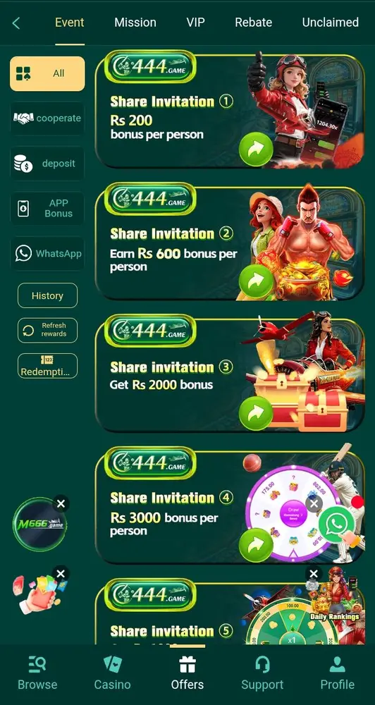 The main focus of C444 Game is to ensure players that they will not face any kind of issues while registering and playing the games.In addition to that the app provides various bonuses like, daily login buns, referral bonus and first deposit bonus as well. Also tis game allows players to play different games and ways to win real cash rewards.Moreover, the accessibility of the game is too simple which provides a good customer support program,and multiple language system.
