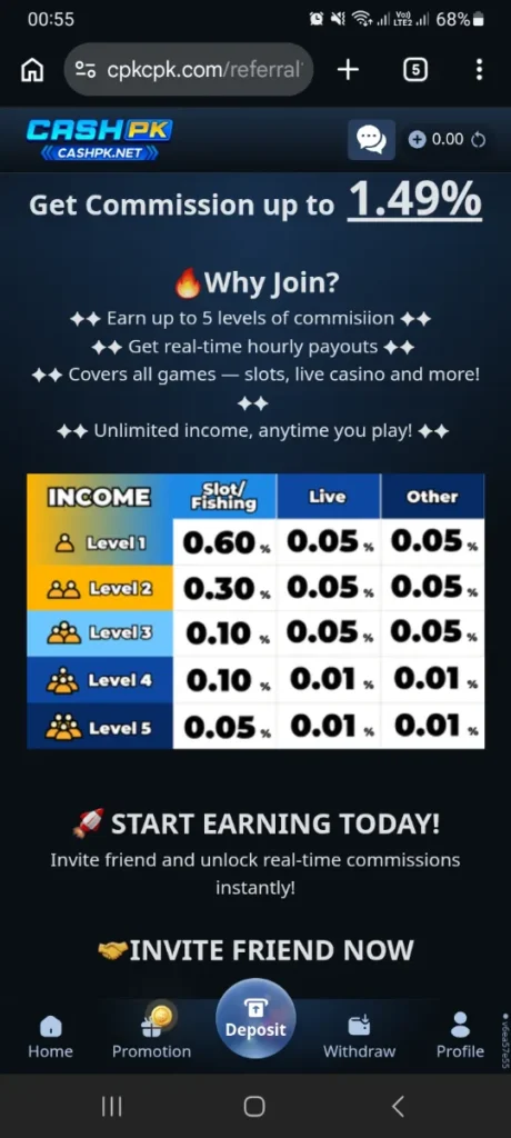 One of the strongest features of Cashpk is its referral system. Not only can users earn from gameplay, but they can also generate passive income.